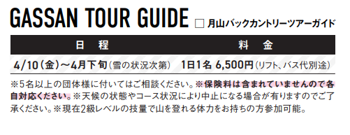 | 料金 | 1日 1名 6,500円(リフト、バス代別途) |