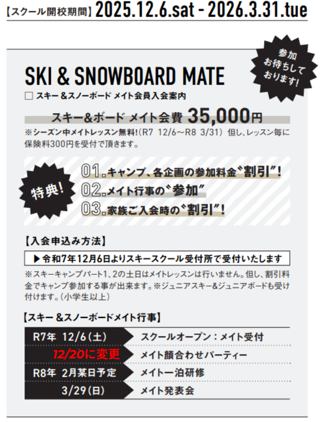 シーズン中メイトレッスン無料!(R7 12/6~R8 3/31)但し、レッスン毎に保険料300円を受付でいただきます。